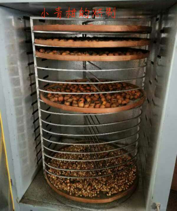 下面的是2018年12月公司用普洱的陳皮與公司的茶葉結合,制作的小青柑。青柑工藝種類的區(qū)別主要出現(xiàn)在干燥環(huán)節(jié),干燥方式的不同使之形成了不同的風味與口感。烘制時間是18個小時,低溫烘焙,采用60℃左右的溫度,將小青柑烘焙至干燥。時間和成本雖有提高,但比起高溫烘焙工藝來說,口感更好,提香適當,兼以保持了活性,為后期轉化保留了空間。